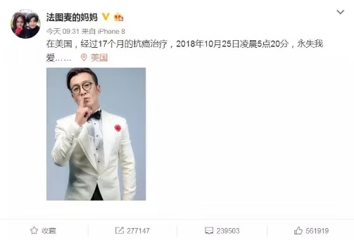 29日上午,哈文發(fā)文稱丈夫李詠因病去世,她寫道“在美國,經(jīng)過17個(gè)月的抗癌治療,2018年10月25日凌晨5點(diǎn)20分,永失我愛。